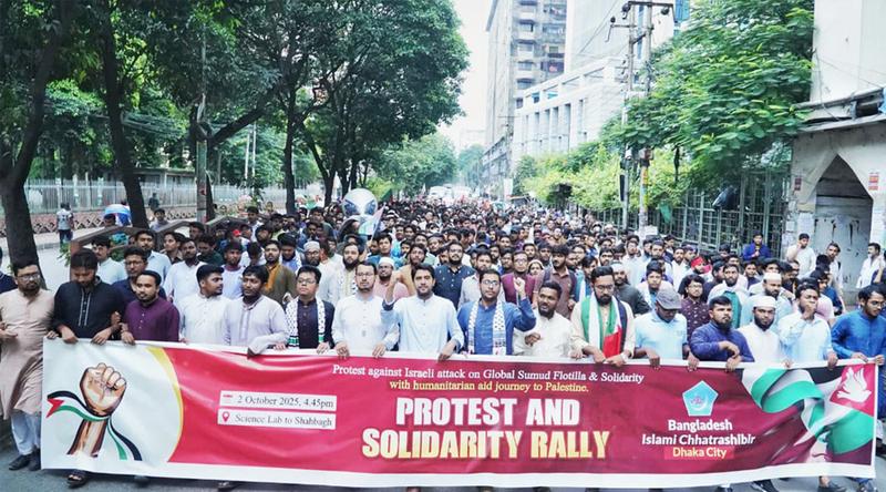 গ্লোবাল সুমুদ ফ্লোটিলার ওপর ইসরায়েলি হামলার প্রতিবাদে এবং ফিলিস্তিনে মানবিক সহায়তা যাত্রার প্রতি সংহতি জানিয়ে রাজধানীতে ‘প্রোটেস্ট অ্যান্ড সলিডারিটি র‍্যালি’ আয়োজন করেছে ইসলামী ছাত্রশিবির।