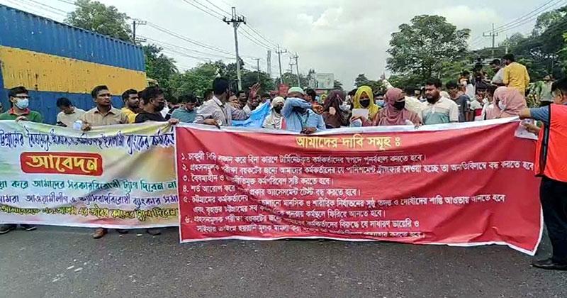সকাল ১১টার দিকে মহাসড়কের পাশে মানববন্ধন কর্মসূচি পালন করেন চাকরিচ্যুত কর্মকর্তারা। পরে পৌনে ১২টার দিকে তারা সড়কে বসে অবরোধ শুরু করেন। এতে শত শত কর্মকর্তা অংশ নেন।