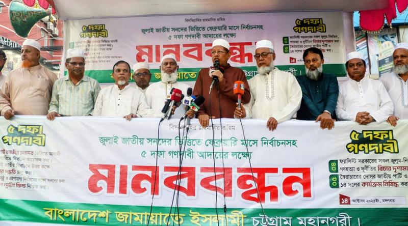 বাংলাদেশ জামায়াতে ইসলামীর কেন্দ্রীয় মজলিসে শূরার সদস্য, চট্টগ্রাম মহানগরীর ভারপ্রাপ্ত আমির পরিবেশবিদ মুহাম্মদ নজরুল ইসলামের সভাপতিত্বে ও মহানগরী সেক্রেটারি ও চট্টগ্রাম-২ ফটিকছড়ি আসনের সংসদ সদস্য পদপ্রার্থী অধ্যক্ষ মুহাম্মদ নুরুল আমিনের পরিচালনায় মানববন্ধনে বক্তব্য রাখেন বাংলাদেশ জামায়াতে ইসলামীর কেন্দ্রীয় মজলিসে শূরার সদস্য ও চট্টগ্রাম মহানগরীর অ্যাসিস্ট্যান্ট সেক্রেটারি মোহাম্মদ উল্লাহ প্রমুখ।