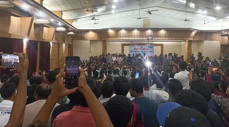 এ সময় ‘ইনকিলাব জিন্দাবাদ’, ‘তুমি ও জানো, আমি ও জানি, আমরা সবাই বাংলাদেশি’, ‘চাকসু চাকসু’, ‘নারায়ে তাকবির, আল্লাহু আকবার’, ‘আমার দেশ, আমার দেশ, বাংলাদেশ’, ‘দিল্লি না ঢাকা, ঢাকা ঢাকা’, এমন নানা স্লোগানে মুখরিত হয়ে ওঠে অডিটোরিয়াম এলাকা।