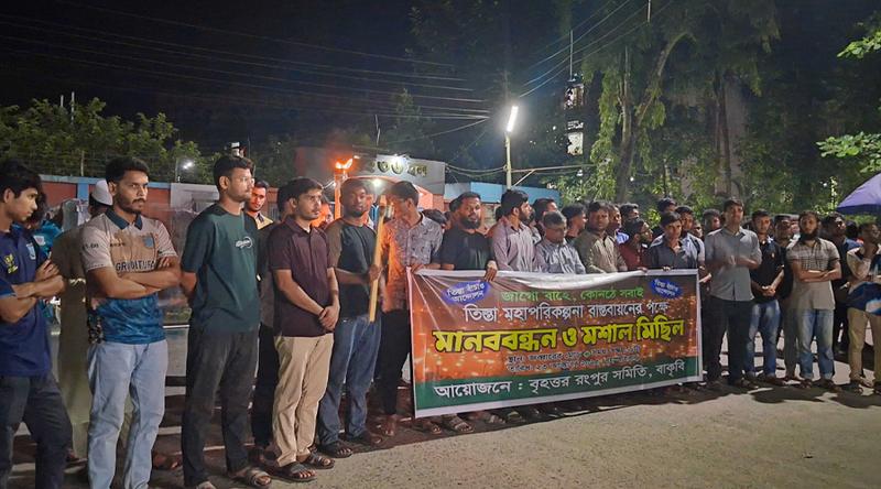 তিস্তা মহাপরিকল্পনা বাস্তবায়নের দাবিতে বাংলাদেশ কৃষি বিশ্ববিদ্যালয়ে (বাকৃবি) মানববন্ধন ও মশাল মিছিল অনুষ্ঠিত হয়েছে।