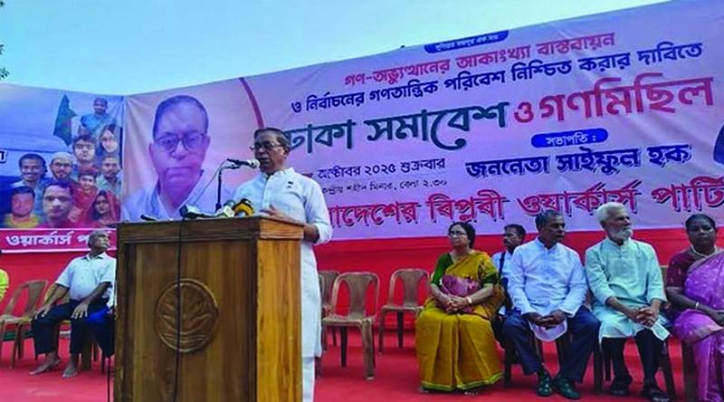 বিপ্লবী ওয়ার্কার্স পার্টির সাধারণ সম্পাদক সাইফুল হক বলেছেন, বর্তমান সরকারকে এখন তত্ত্বাবধায়ক সরকারের ভূমিকা নিতে হবে। শুক্রবার (২৪ অক্টোবর) কেন্দ্রীয় শহীদ মিনারে বাংলাদেশ বিপ্লবী ওয়ার্কার্স পার্টির ‘গণ-অভ্যুত্থানের আকাঙ্ক্ষা বাস্তবায়ন ও নির্বাচনের গণতান্ত্রিক পরিবেশ নিশ্চিতকরণ’ স্লোগানে এক সমাবেশে তিনি এসব কথা বলেন।