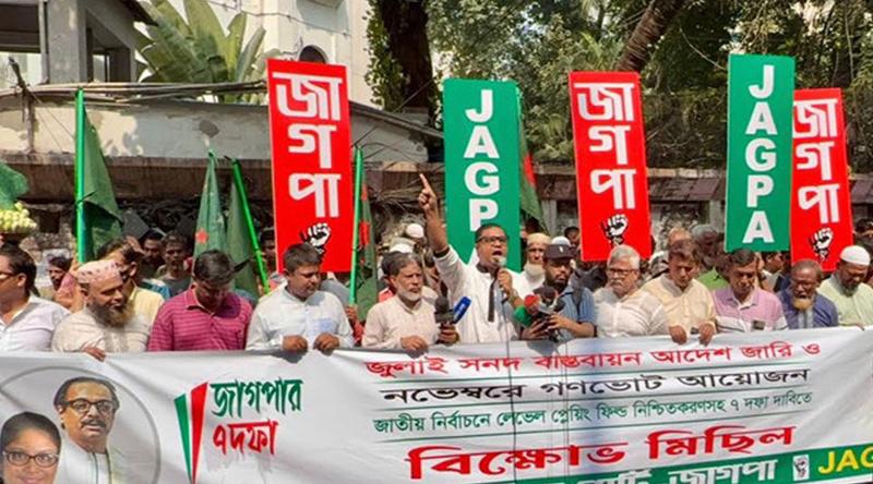 জাগপা মুখপাত্র বলেন, ‘শুনেছিলাম আইন সবার জন্য সমান। গুম-খুনে জড়িত সাবেক সেনা কর্মকর্তাদের জন্য এসি গাড়ি, স্পেশাল জেল নামক বাড়ি কেন? তাদের পরিচয় সেনা কর্মকর্তা নয়, তাদের পরিচয় এখন সন্ত্রাসী। আইন লেভেল প্লেয়িং ফিল্ড না হলে জাতীয় নির্বাচনে লেভেল প্লেয়িং ফিল্ড হবে কিভাবে? জাতীয় নির্বাচনে লেভেল প্লেয়িং ফিল্ড সৃষ্টি করার জন্য হাসিনা প্রশাসন এবং নির্বাচনের আগেই ক্ষমতায় চলে আসা নতুন দলীকরণ মুক্ত প্রশাসন লাগবে। তার আগে জুলাই সনদ বাস্তবায়ন আদেশ জারি করতে হবে, নভেম্বরে গণভোট আয়োজন করতে হবে।’