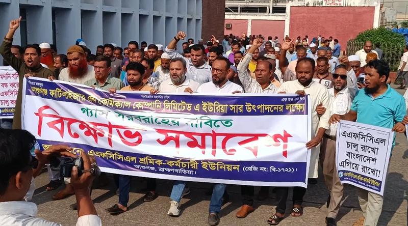 ব্রাহ্মণবাড়িয়ার আশুগঞ্জ সার কারখানায় গ্যাস সরবরাহ করে পুনরায় উৎপাদন শুরুর দাবিতে বিক্ষোভ মিছিল ও সমাবেশ অনুষ্ঠিত হয়েছে।