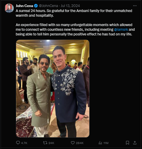 জন সিনার শাহরুখ-ভক্তি নতুন নয়। ২০২৪ সালের জুলাইয়ে মুম্বাইয়ে অনন্ত আম্বানির বিয়েতে দু’জনের সাক্ষাৎ হয়, যা সিনা পরবর্তীতে ‘অত্যন্ত আবেগঘন ও অবিশ্বাস্য অভিজ্ঞতা’ বলে বর্ণনা করেন।