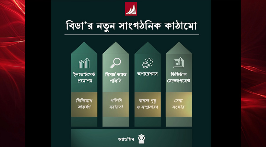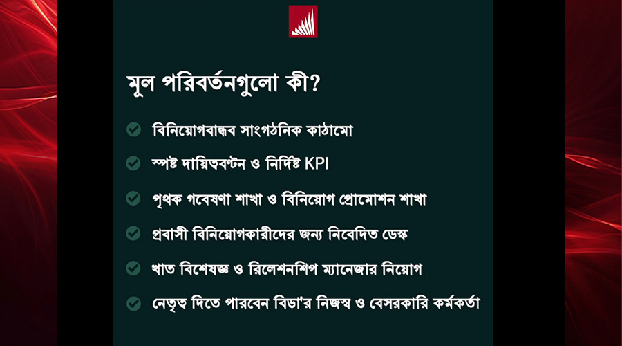 বিনিয়োগকারীকেন্দ্রিক নতুন সাংগঠনিক কাঠামো চালু করেছে বাংলাদেশ ইনভেস্টমেন্ট ডেভেলপমেন্ট অথরিটি (বিডা)। ইনভেস্টর জার্নিকে কেন্দ্র করে গঠিত এ কাঠামোয় প্রবাসী বিনিয়োগকারীদের জন্য আলাদা ডেস্ক, রিসার্চ উইং, সেক্টর ও কান্ট্রি স্পেশালিস্টসহ দুর্নীতিরোধে ডিজিটাল মনিটরিং ব্যবস্থা রাখা হয়েছে। বিডা বলছে, এই উদ্যোগের লক্ষ্য পরবর্তী সরকারের জন্য একটি শক্তিশালী বিনিয়োগভিত্তি তৈরি করা।