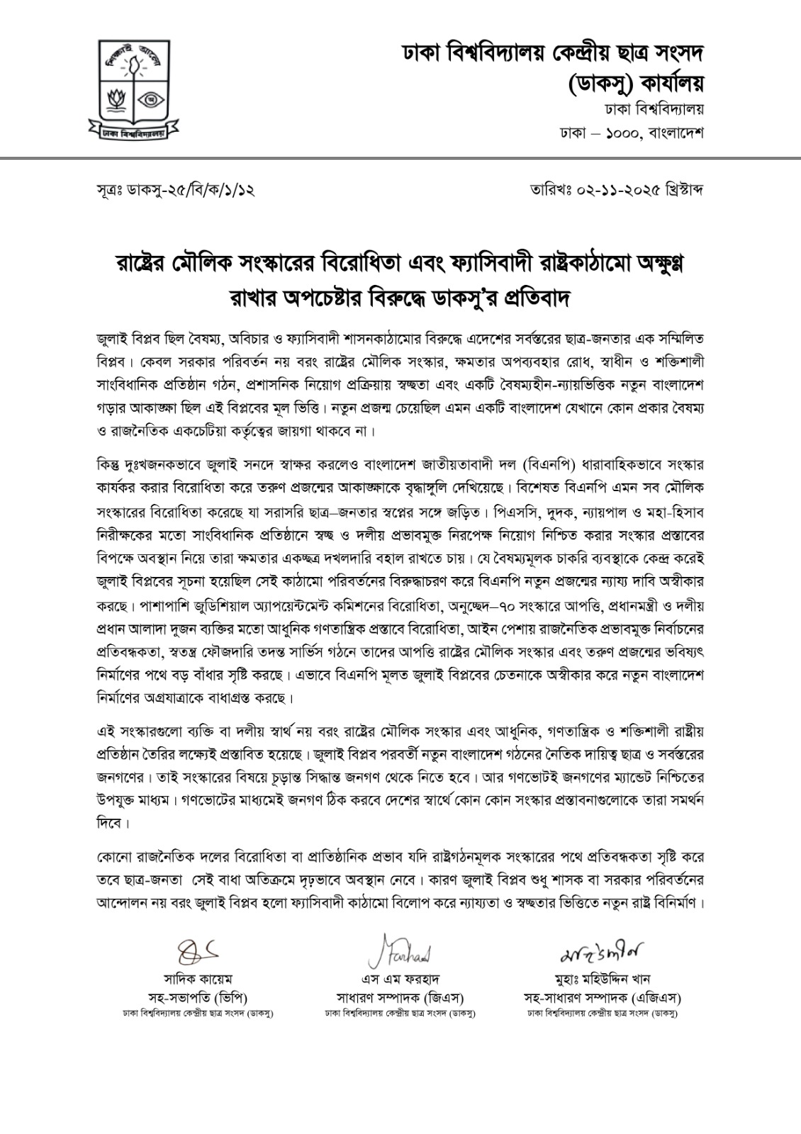 ডাকসুর নেতৃবৃন্দ বলেন, দুঃখজনকভাবে জুলাই সনদে স্বাক্ষর করলেও বাংলাদেশ জাতীয়তাবাদী দল (বিএনপি) ধারাবাহিকভাবে সংস্কার কার্যকর করার বিরোধিতা করে তরুণ প্রজন্মের আকাঙ্ক্ষাকে বৃদ্ধাঙ্গুলি দেখিয়েছে। বিশেষত বিএনপি এমন সব মৌলিক সংস্কারের বিরোধিতা করেছে যা সরাসরি ছাত্র–জনতার স্বপ্নের সঙ্গে জড়িত। পিএসসি, দুদক, ন্যায়পাল ও মহা-হিসাব নিরীক্ষকের মতো সাংবিধানিক প্রতিষ্ঠানে স্বচ্ছ ও দলীয় প্রভাবমুক্ত নিরপেক্ষ নিয়োগ নিশ্চিত করার সংস্কার প্রস্তাবের বিপক্ষে অবস্থান নিয়ে তারা ক্ষমতার একচ্ছত্র দখলদারি বহাল রাখতে চায়। যে বৈষম্যমূলক চাকরি ব্যবস্থাকে কেন্দ্র করেই জুলাই বিপ্লবের সূচনা হয়েছিল সেই কাঠামো পরিবর্তনের বিরুদ্ধাচরণ করে বিএনপি নতুন প্রজন্মের ন্যায্য দাবি অস্বীকার করছে। পাশাপাশি জুডিশিয়াল অ্যাপয়েন্টমেন্ট কমিশনের বিরোধিতা, অনুচ্ছেদ–৭০ সংস্কারে আপত্তি, প্রধানমন্ত্রী ও দলীয় প্রধান আলাদা দুজন ব্যক্তির মতো আধুনিক গণতান্ত্রিক প্রস্তাবে বিরোধিতা, আইন পেশায় রাজনৈতিক প্রভাবমুক্ত নির্বাচনের প্রতিবন্ধকতা, স্বতন্ত্র ফৌজদারি তদন্ত সার্ভিস গঠনে তাদের আপত্তি রাষ্ট্রের মৌলিক সংস্কার এবং তরুণ প্রজন্মের ভবিষ্যৎ নির্মাণের পথে বড় বাঁধার সৃষ্টি করছে। এভাবে বিএনপি মূলত জুলাই বিপ্লবের চেতনাকে অস্বীকার করে নতুন বাংলাদেশ নির্মাণের অগ্রযাত্রাকে বাধাগ্রস্ত করছে।
