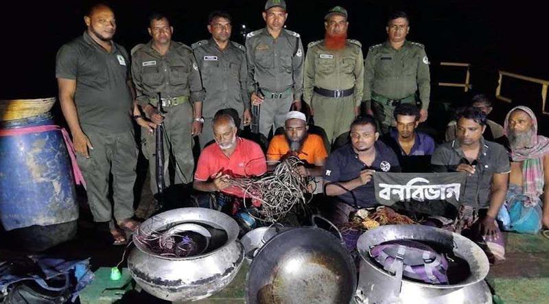 আটক শিকারিরা হলেন বাগেরহাটের রামপাল উপজেলার শগুনা গ্রামের তারাপদ পালের ছেলে মনোজ পাল (৪২), বাইনতলা গ্রামের আ. হামিদের ছেলে মুজিবুর রহমান (৫৬), চাঁনপুর গ্রামের তাজুল ইসলামের ছেলে মুনাফ আলী মোল্লা (২২), একই গ্রামের খাদেম শেখের ছেলে মোজাম্মেল শেখ (৫২), বারইপাড়া গ্রামের কানা বাবুর ছেলে খান তামিম (২০), সত্তার মল্লিকের ছেলে ওহিদ মল্লিক (৩৬) ও মোংলা উপজেলার জয়মনি গ্রামের সুন্দর আলীর ছেলে আলী হোসেন (৪৫)।