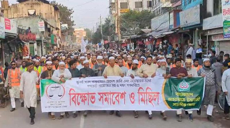 জুলাই সনদ বাস্তবায়নের আদেশ জারি, নভেম্বরের মধ্যে গণভোট আয়োজনসহ পাঁচ দাবিতে সাতক্ষীরায় বিক্ষোভ সমাবেশ ও মিছিল করেছে জামায়াতে ইসলামী।