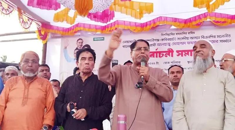 নোয়াখালী-৫ (কোম্পানীগঞ্জ-কবিরহাট ও সদরের আংশিক) আসনে ধানের শীষের প্রার্থী জেলা বিএনপির নেতা মো. ফখরুল ইসলাম বলেছেন, আপনারা ধানের শীষে ভোট দিলে তারেক রহমান প্রধানমন্ত্রী হবেন। আর তিনি প্রধানমন্ত্রী হলে নদীভাঙন কবলিত নোয়াখালী হবে সিঙ্গাপুর।