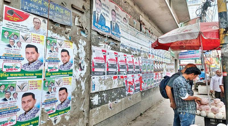 শহর যেন নিজের রঙ হারিয়ে রাজনৈতিক প্রচারণা, ব্যবসায়িক বিজ্ঞাপন আর ব্যক্তিগত প্রচারনার স্তূপে ঢাকা পড়ে গেছে। শহরের আকাশ দিনে দিনে ছেয়ে গেছে রঙিন কাপড়, প্লাস্টিক আর কাগজের ভিড়ে। প্রধান সড়ক থেকে শুরু করে অলিগলি যেখানে তাকানো যায়, সেখানেই দুলছে ব্যানার, ফেস্টুন ও নানা রঙের পোস্টার। রাজধানী এক বিশাল প্রচারণা-প্রদর্শনীতে ঢেকে শহরের নিজস্ব সৌন্দর্যের হারানোর মধ্যে দিয়ে ঢাকা যেন ঢাকা পড়েছে।