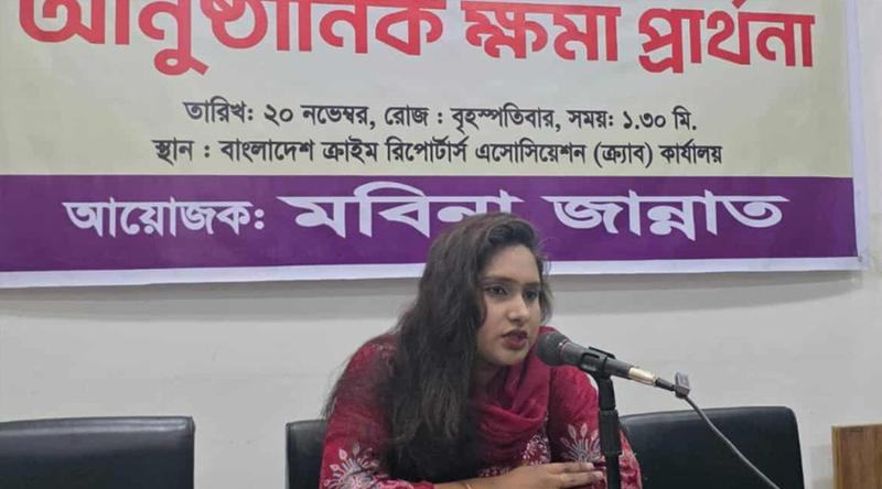 বৃহস্পতিবার (২০ নভেম্বর) দুপুরে বাংলাদেশ ক্রাইম রিপোর্টাস অ্যাসোসিয়েশনে (ক্র্যাব) এক সংবাদ সম্মেলনে মবিনা জান্নাত নামের ওই নারী বলেন, “গভীর অনুতাপ নিয়ে আপনাদের সামনে হাজির হয়েছি। একটি ‘slip of tongue’-এর কারণে একজন সম্মানিত মানুষের প্রতি একটি অন্যায় পরিস্থিতি তৈরি হয়েছে।