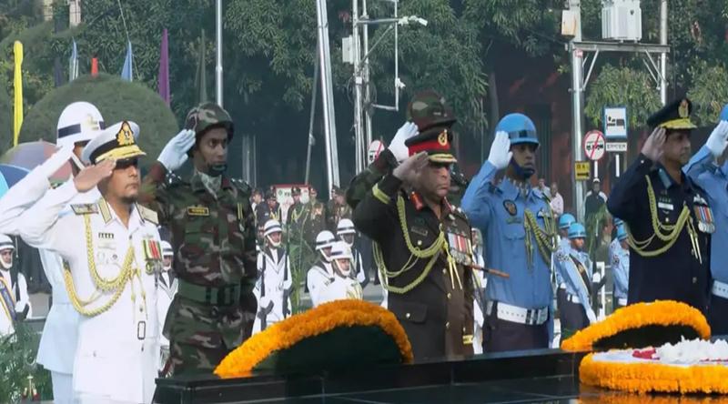 সশস্ত্র বাহিনী দিবস উপলক্ষে শিখা অনির্বাণে শ্রদ্ধা নিবেদন করেছেন সেনাবাহিনী প্রধান জেনারেল ওয়াকার-উজ-জামান, নৌবাহিনী প্রধান অ্যাডমিরাল মোহাম্মদ নাজমুল হাসান এবং বিমানবাহিনী প্রধান এয়ার চিফ মার্শাল হাসান মাহমুদ খাঁন।