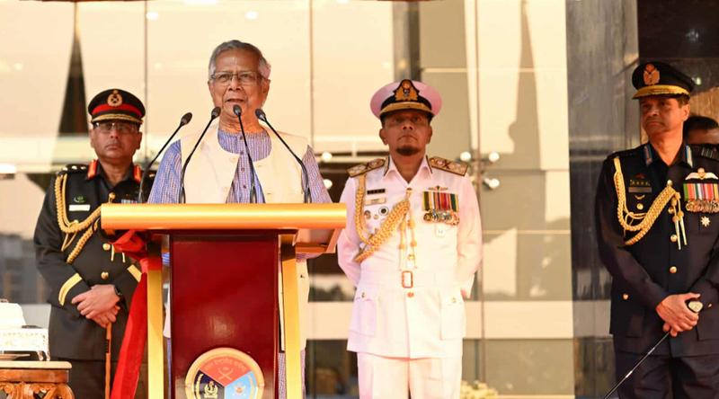 মুহাম্মদ ইউনূস বলেন, দেশের স্বাধীনতা ও সার্বভৌমত্ব রক্ষার পাশাপাশি দেশগঠন ও জাতীয় দুর্যোগ মোকাবিলায় সশস্ত্র বাহিনী সর্বদাই জনগণের পাশে থেকে কাজ করে যাচ্ছে। ২০২৪ সালের ছাত্র-জনতার অভ্যুত্থান ও চলমান দেশ পুনর্গঠন এবং সংস্কারের কাজেও সশস্ত্র বাহিনী বরাবরের মতোই মানুষের পাশে দাঁড়িয়ে দেশের মানুষের আস্থার প্রতিদান দিচ্ছে। তিনি বিশ্বাস প্রকাশ করেন যে গণতান্ত্রিক ও নিয়মতান্ত্রিক নেতৃত্বের প্রতি অনুগত বাংলাদেশ সশস্ত্র বাহিনী পেশাগত দক্ষতা ও দেশপ্রেমের সমন্বয়ে ত্যাগ ও তৎপরতার এই ধারাবাহিকতা অক্ষুণ্ণ রাখবে।
