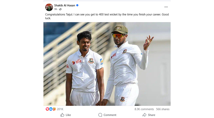 সাকিব তার ভেরিফায়েড ফেসবুক পেজের এক পোস্টে তাইজুলের সঙ্গে নিজের একটি ছবি জুড়ে দিয়ে লেখেন, ‘অভিনন্দন, তাইজুল। আমি দেখছি, তুই যখন তোর ক্যারিয়ার শেষ করবি, তখন তোর ঝুলিতে ৪০০ উইকেট থাকবে। শুভকামনা।’
