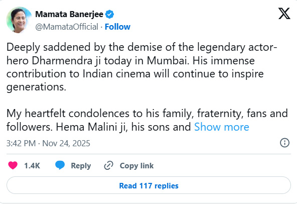৩.৫০- কিংবদন্তি অভিনেতার প্রয়াণে শোকপ্রকাশ বাংলার মুখ্যমন্ত্রী মমতা বন্দ্যোপাধ্যায়ের। শোকপ্রকাশ করে লিখেছেন, ‘কিংবদন্তি অভিনেতা-নায়ক ধর্মেন্দ্রজির প্রয়াণে গভীরভাবে শোকাহত। ভারতীয় চলচ্চিত্রে তাঁর অসামান্য অবদান প্রজন্মের পর প্রজন্মকে অনুপ্রাণিত করবে। ধর্মেন্দ্রজির পরিবার, বন্ধুবান্ধব, ভক্তমহলের প্রতি আমার সমবেদনা রইল। হেমা মালিনীজি ও পুত্রকন্যারা তাঁর সমৃদ্ধ উত্তরাধিকার বহন করবেন। তাঁর আত্মার শান্তি কামনা করি।’