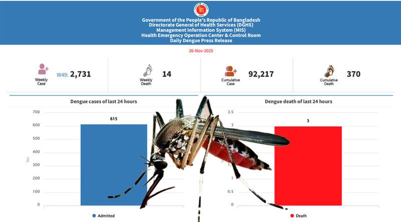 বুধবার (২৬ নভেম্বর) স্বাস্থ্য অধিদপ্তরের হেলথ অ্যান্ড ইমার্জেন্সি অপারেশন সেন্টার ও কন্ট্রোল রুমের সংবাদ বিজ্ঞপ্তি থেকে এ তথ্য জানা গেছে।