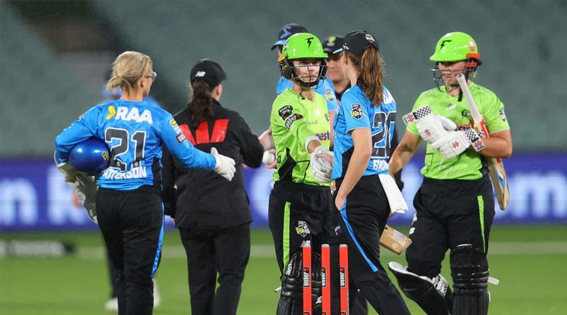 নারী বিগ ব্যাশের ২৭তম ম্যাচে আজ (শুক্রবার) অ্যাডিলেড ওভালে মুখোমুখি হয়েছিল স্বাগতিক অ্যাডিলেড স্ট্রাইকার্স ও সিডনি থান্ডার। বৃষ্টিতে লম্বা সময় অতিক্রান্ত হওয়ার পর খেলা মাত্র ৫ ওভারে নির্ধারিত হয়। আগে ব্যাট করতে নেমে তাহলিয়া ম্যাকগ্রা’র নেতৃত্বাধীন স্বাগতিক অ্যাডিলেড ২ উইকেট হারিয়ে ৪৫ রান তোলে। তাদের পক্ষে দক্ষিণ আফ্রিকান অধিনায়ক লরা উলভার্ট ২২ ও অধিনায়ক ম্যাকগ্রা ১২ রানের ক্যামিও ইনিংস খেলেন। সিডনির পক্ষে একটি করে উইকেট শিকার করেন শবনিম ইসমাইল ও লুসি ফিন।