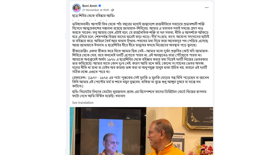 বিশ্ব পর্যটক ও কনটেন্ট ক্রিয়েটর বনি আমিন সম্প্রতি তার ব্যক্তিগত ফেসবুক অ্যাকাউন্টে একটি দীর্ঘ পোস্টে ছাত্রশিবির থেকে বহিষ্কারের অভিজ্ঞতা, জামায়াত-শিবিরের ভবিষ্যৎ সম্ভাবনা এবং নিজের ব্যক্তিগত উপলব্ধি তুলে ধরেছেন। পোস্টটি প্রকাশের পরই অনলাইনে ব্যাপক আলোচনার জন্ম দেয়।
