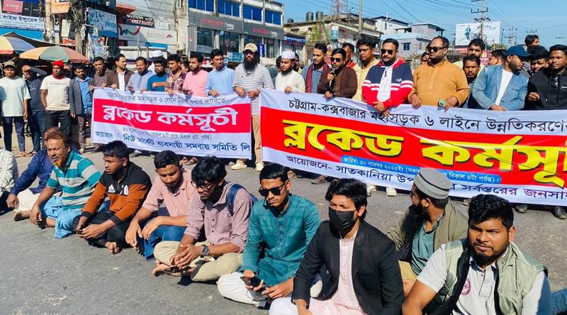 চট্টগ্রামের সাতকানিয়ায় চট্টগ্রাম-কক্সবাজার মহাসড়ক ৬ লেনের দাবিতে ব্লকেড কর্মসূচি পালন করছে স্থানীয়রা।
