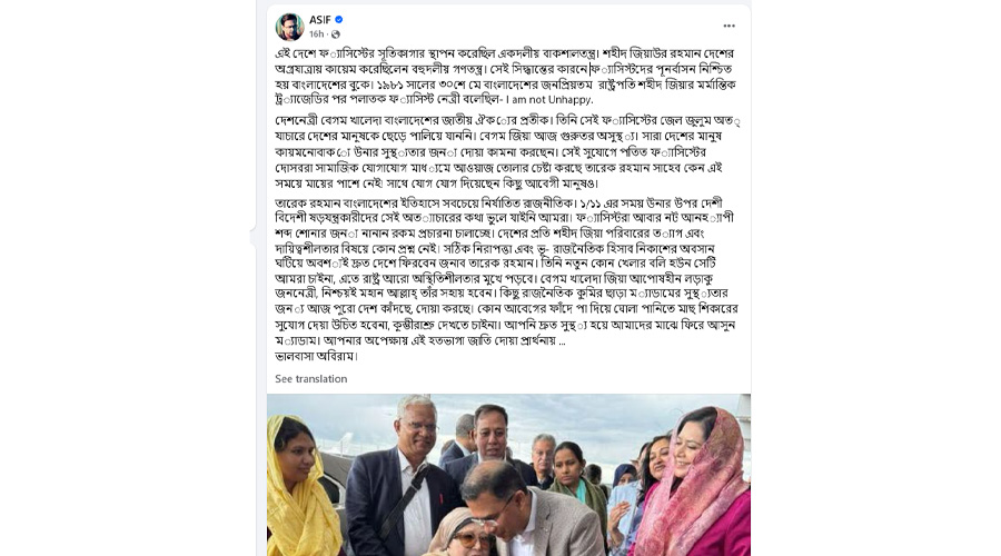 আসিফ আরও লিখেন, দেশনেত্রী খালেদা জিয়া বাংলাদেশের জাতীয় ঐক্যের প্রতীক। তিনি কখনও ফ্যাসিস্টদের ভয়-জুলুম-অত্যাচারের মুখে দেশ ছেড়ে পালিয়ে যাননি। আজ এই আপসহীন নেত্রী গুরুতর অসুস্থ। সারাদেশের মানুষ তার সুস্থতার জন্য পরম আন্তরিকতায় দোয়া করছেন। কিন্তু সেই সুযোগে কিছু লোক সামাজিক যোগাযোগমাধ্যমে প্রশ্ন তুলছেন- তারেক রহমান কেন এই সময়ে মায়ের পাশে নেই? আবেগতাড়িত কিছু মানুষও এতে যুক্ত হয়েছেন।