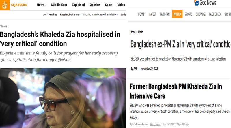 বাংলাদেশের সাবেক প্রধানমন্ত্রী খালেদা জিয়া অত্যন্ত সংকটাপন্ন অসুস্থ অবস্থায় হাসপাতালে ভর্তি রয়েছেন—এমন খবর গুরুত্ব দিয়ে প্রকাশ করেছে বিভিন্ন আন্তর্জাতিক গণমাধ্যমে।