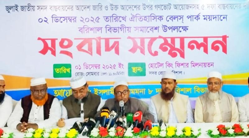 বরিশালে বাংলাদেশ জামায়াতে ইসলামীসহ সমমনা আট দলের বিভাগীয় সমাবেশ আগামী ২ ডিসেম্বর (মঙ্গলবার) অনুষ্ঠিত হবে। সমাবেশ সফল করার লক্ষ্যে আজ সোমবার (১ ডিসেম্বর) বরিশাল শহরের একটি হোটেলে আয়োজিত সংবাদ সম্মেলনে দলগুলোর কেন্দ্রীয় ও স্থানীয় নেতারা এ তথ্য জানান।