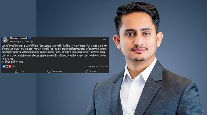 মোতালেব হোসেন তার ফেসবুকে লেখেন, ‘সাইফুল ইসলামকে এনসিপিতে এনেছে রাজশাহী বিভাগীয় সংগঠক ইমরান ইমন এবং তিনিই তাকে পদ দিয়েছেন। আমরা দেখেছি, ইমরান ইমনের সঙ্গে সারজিস আলমের ঘনিষ্ঠ সম্পর্ক রয়েছে। অনেকবার বিষয়টি জানালেও সারজিস আলম কোনো ব্যবস্থা নেননি। এর মানে তিনিও জড়িত।’