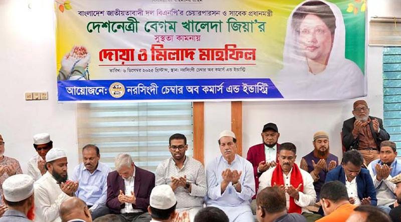 নরসিংদী চেম্বার অব কমার্স অ্যান্ড ইন্ডাস্ট্রির সভাপতি রাশেদুল হাসান রিন্টু (সিআইপি) বলেন, সারাদেশে বেগম খালেদা জিয়ার সুস্থতার জন্য দোয়া করা হচ্ছে। আমরা দেশনেত্রী বেগম খালেদা জিয়ার সুস্থতা কামনায় এতিম শিশুদের মাধ্যমে কোরআন খতম দিয়েছি। আমরা দোয়া করি দেশনেত্রী সুস্থ হয়ে আমাদের মাঝে ফিরে আসবেন।