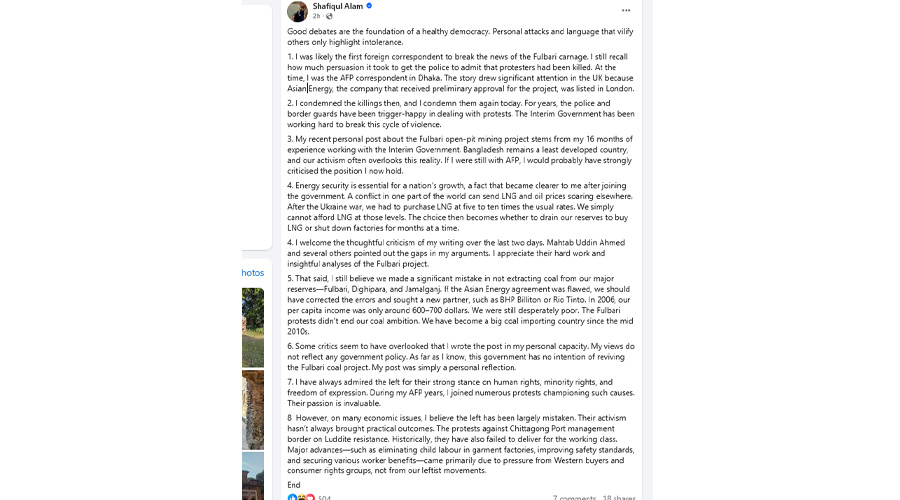 তিনি বলেন, ‘কিছু সমালোচক হয়তো খেয়াল করেননি, আমি পোস্টটি সম্পূর্ণ ব্যক্তিগত ক্ষমতায় লেখেছি। আমার মতামত কোনো সরকারি নীতির প্রতিফলন নয়। আমার জানামতে, এই সরকারের ফুলবাড়ী কয়লা প্রকল্প পুনরুজ্জীবিত করার কোনো পরিকল্পনা নেই। আমার পোস্টটি ছিল কেবল একটি ব্যক্তিগত ভাবনা। আমি সবসময় বামপন্থীদের মানবাধিকার, সংখ্যালঘু অধিকার এবং মতপ্রকাশের স্বাধীনতার পক্ষে দৃঢ় অবস্থানের প্রশংসা করেছি। এএফপিতে কাজ করার সময় আমি এ ধরনের আন্দোলনে অনেকবার অংশ নিয়েছি। তাদের এই আবেগ ও আন্তরিকতা অমূল্য।’