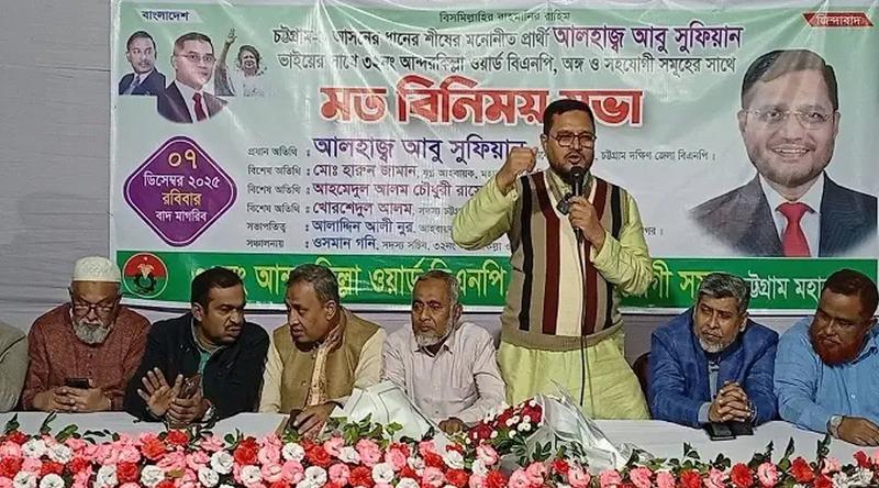সোমবার (৮ নভেম্বর) সন্ধ্যায় ৩২নং আন্দরকিল্লা ওয়ার্ড বিএনপি, অঙ্গ ও সহযোগী সংগঠন আয়োজিত মতবিনিময় সভায় এসব কথা বলেন তিনি। নেতাকর্মীদের উদ্দেশ্যে আবু সুফিয়ান বলেন, বিএনপির ওপর মানুষের আকাঙ্ক্ষা অনেক বেশি। তাই মানুষের অন্তরে আঘাত লাগে এমন কোনো কর্মকাণ্ড করা যাবে না। নিজের ও দলের সুনাম ক্ষুণ্ন হয় এমন ধরনের কর্মকাণ্ডে লিপ্ত হওয়া যাবে না। পতিত আওয়ামী লীগ থেকে শিক্ষা নিতে হবে। কেন তাদের পালাতে হয়েছে- তা অনুধাবন করতে হবে।