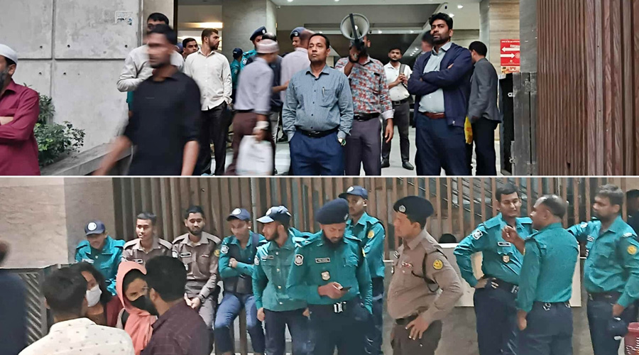 কর্মচারীরা শুধু স্লোগানই দেননি, মন্ত্রণালয়ের ভবন থেকে বের হওয়ার সব গেটেও তাদের সদস্যদের মোতায়েন করে রেখেছেন।