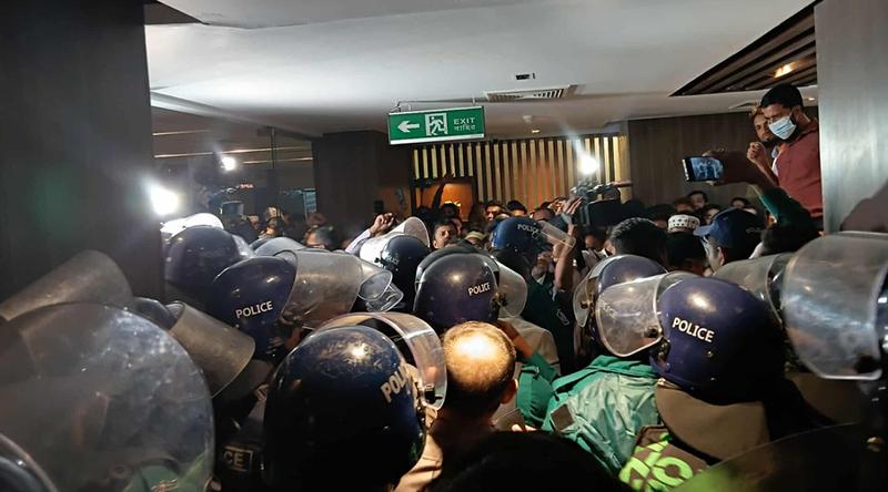 টানা ৬ ঘণ্টার বেশি সময় অর্থ উপদেষ্টাকে অবরুদ্ধ রাখার পর এবার শক্ত অবস্থানে যাচ্ছে পুলিশ। পুলিশের বিশেষায়িত একটি ইউনিট নিরাপত্তা সরঞ্জাম পরে আন্দোলনকারীদের ছত্রভঙ্গ করার চেষ্টা করছেন।