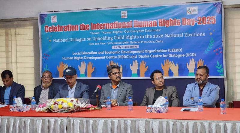 শিশু অধিকার সুরক্ষাসহ চারটি বিষয় নির্বাচনী ইশতেহারে অন্তর্ভুক্ত করার দাবি জানিয়েছে লোকাল এডুকেশন অ্যান্ড ইকোনমিক ডেভেলপমেন্ট অর্গানাইজেশন (লিডো), হিউম্যান রাইটস ডেভেলপমেন্ট সেন্টার (এইচআরডিসি) ও ঢাকা সেন্টার ফর ডায়ালগ (ডিসিডি)।