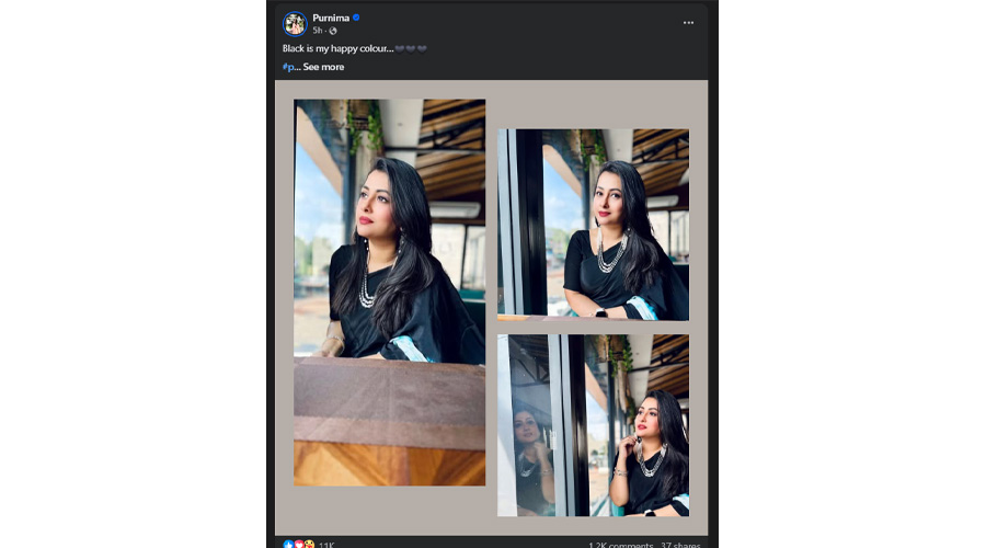 বৃহস্পতিবার বিকেলে পূর্ণিমা তার ভেরিফায়েড ফেসবুক পেজে নতুন কয়েকটি ছবি প্রকাশ করেন। সেখানে দেখা যায়, কালো রঙের শাড়িতে সজ্জিত পূর্ণিমা, সঙ্গে মিলিয়ে গহনা। ছবির ক্যাপশনে তিনি লিখেছেন, ‘ব্ল্যাক ইজ মাই হ্যাপি কালার।’