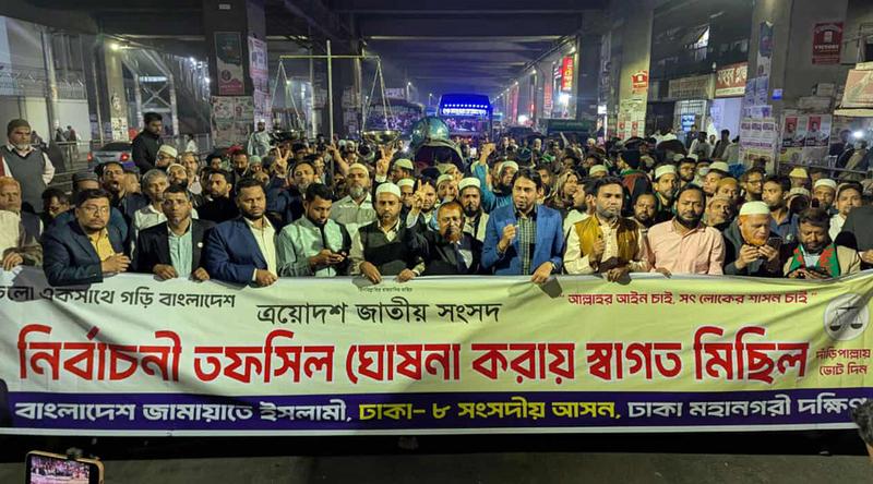 ত্রয়োদশ জাতীয় সংসদ নির্বাচনের তফসিল ঘোষণাকে স্বাগত জানিয়ে আনন্দ মিছিল করেছে বাংলাদেশ জামায়াতে ইসলামী।