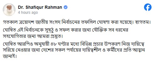 তফশিল ঘোষণাকে স্বাগত জানিয়ে ডা. শফিকুর রহমান লিখেছেন, ‘বৃহস্পতিবার (১১ ডিসেম্বর) সন্ধ্যায় আগামী ত্রয়োদশ জাতীয় সংসদ নির্বাচনের তফশিল ঘোষণা করা হয়েছে। স্বাগতম। ঘোষিত এই নির্বাচনকে সুষ্ঠু ও সফল করার জন্য যৌক্তিক সব ধরনের সহযোগিতার জন্য আমরা প্রস্তুত।’