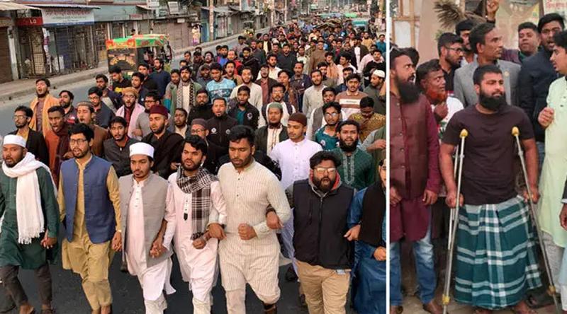 শাবিপ্রবি: বিকেল সাড়ে ৪টায় শাহজালাল বিজ্ঞান ও প্রযুক্তি বিশ্ববিদ্যালয়ের শাহপরাণ হল থেকে বিক্ষোভ মিছিল নিয়ে ক্যাম্পাসে আসেন শিক্ষার্থীরা। মিছিল শেষে তারা ক্যাম্পাসের গোলচত্বরে মানববন্ধন করেন। পরে হাদির সুস্থতা কামনায় দোয়া মুনাজাত হয়।