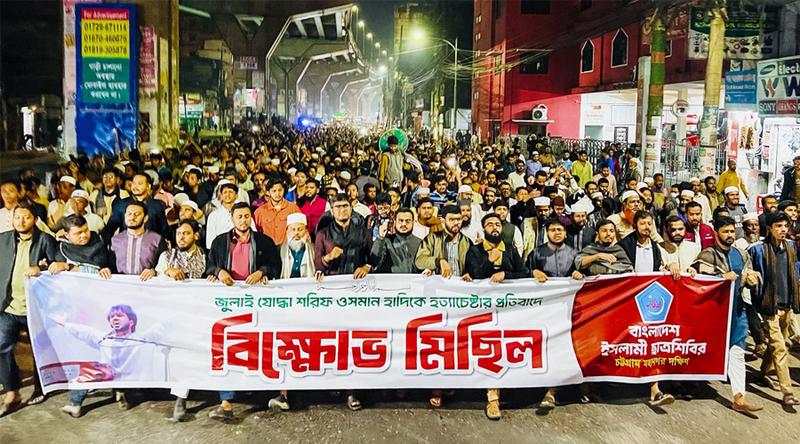 ইনকিলাব মঞ্চের শরীফ ওসমান হাদির ওপর হামলার প্রতিবাদে চট্টগ্রামে বিক্ষোভ মিছিল করেছে ইসলামী ছাত্রশিবিরের নেতাকর্মীরা। শুক্রবার (১২ ডিসেম্বর) দিবাগত রাত ৮টার দিকে সংগঠনটির মহানগর দক্ষিণ শাখার উদ্যোগে নগরের দেওয়ানহাট মোড় থেকে আগ্রাবাদ পর্যন্ত এ কর্মসূচি পালিত হয়।