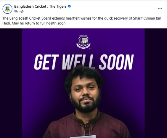 সেখানে লেখা হয়, ‘বাংলাদেশ ক্রিকেট বোর্ড শরীফ ওসমান বিন হাদির দ্রুত আরোগ্য কামনা করছে। তিনি শীঘ্রই পূর্ণ সুস্থ হয়ে ফিরে আসেন, সেই কামনা করছে বোর্ড। আমাদের ভাবনা ও প্রার্থনা আপনার সঙ্গে আছে।’