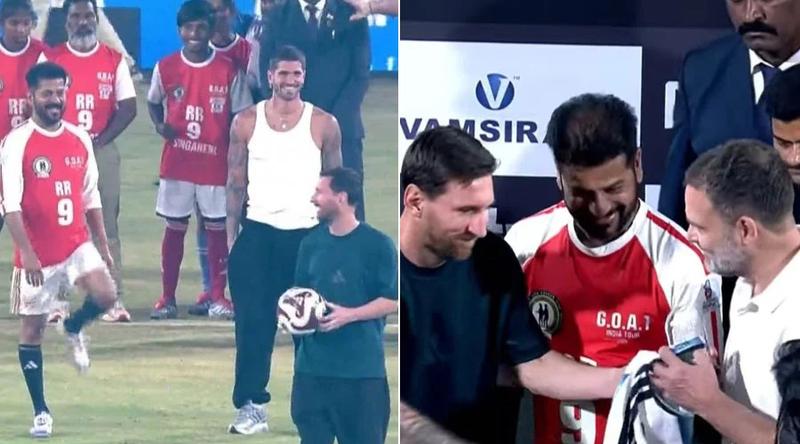 পায়ে পায়ে বল নাচাচ্ছেন। ঠিক যে কাজের জন্য লিওনেল মেসি পরিচিত। এটা হতে পারত কলকাতার যুবভারতী ক্রীড়াঙ্গনে। কিন্তু শেষ পর্যন্ত সেই ঘটনার সাক্ষী থাকল হায়দরাবাদের রাজীব গান্ধী স্টেডিয়াম। পিছনে দাঁড়িয়ে মুচকি হাসছেন রড্রিগো ডি পল, লুইস সুয়ারেজরা। রয়েছেন তেলেঙ্গানার মুখ্যমন্ত্রী রেবন্ত রেড্ডি। মেসি জার্সি উপহার দেন লোকসভার বিরোধী দলনেতা রাহুল গান্ধীকে। উদ্যোক্তা শতদ্রু দত্তকে ইতিমধ্যে কলকাতায় গ্রেপ্তার করা হয়েছে। নেটিজেনরা তো খোঁচা দিতে শুরু করেছেন শতদ্রু ছিলেন না বলেই হায়দরাবাদের অনুষ্ঠান সুষ্ঠুভাবে হয়েছে।