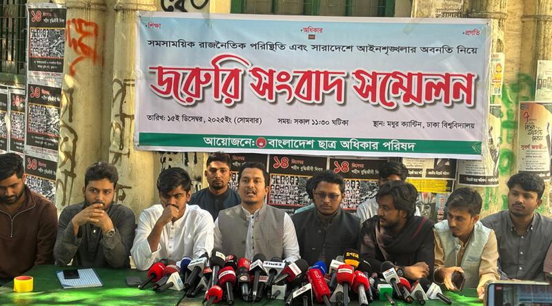 সোমবার (১৫ ডিসেম্বর) ঢাকা বিশ্ববিদ্যালয়ের (ঢাবি) মধুর ক্যান্টিন প্রাঙ্গণে বিরাজমান রাজনৈতিক পরিস্থিতি ও সারা দেশের আইনশৃঙ্খলা পরিস্থিতি নিয়ে আয়োজিত এক জরুরি সংবাদ সম্মেলনে এ দাবি জানান সংগঠনটির নেতারা।
