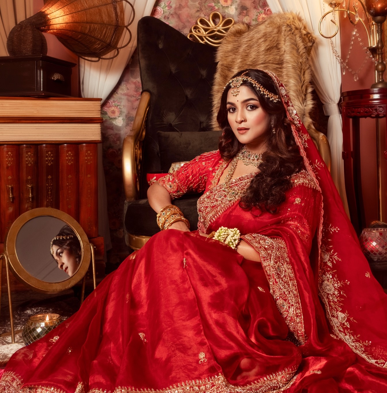 রোববার একগুচ্ছ ছবি প্রকাশ করতেই ভক্তদের চোখ আটকে দিলেন সাদিয়া। যেখানে উঠে আসে তার রাজকীয় সৌন্দর্য। ছবিতে দেখা যায় এক ক্লাসিক অন্দরমহলের আবহে ঘন লাল বেনারসিতে সাদিয়া। শাড়িতে সোনালি জরির সূক্ষ্ম কারুকাজ, নিখুঁত এমব্রয়ডারি; সব মিলিয়ে ঐতিহ্যের সঙ্গে আধুনিক রুচির অপূর্ব মেলবন্ধন।