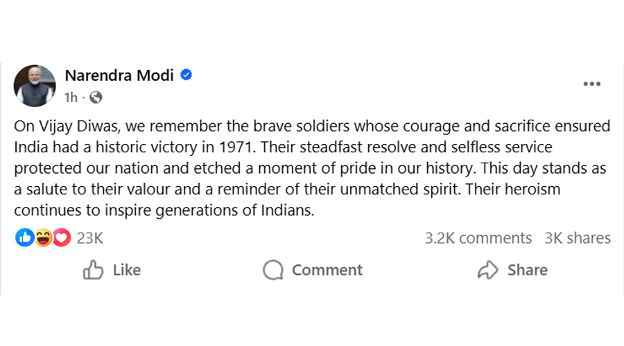 পোস্টে নরেন্দ্র মোদি লিখেছেন, বিজয় দিবসে, আমরা আমাদের সেই সাহসী সেনাদের স্মরণ করছি, যাদের সাহসিকতা এবং আত্মত্যাগ ১৯৭১ সালে ভারতের এক ঐতিহাসিক বিজয় নিশ্চিত করেছিল। তাদের দৃঢ় মনোবল এবং নিঃস্বার্থ সেবা আমাদের দেশকে রক্ষা করেছে এবং আমাদের ইতিহাসে একটি গৌরবান্বিত মুহূর্ত খোদাই করেছে। এই দিনটি তাদের সাহসকে সম্মান জানায় এবং তাদের অসাধারণ মনোবলকে মনে করিয়ে দেয়। সেনাদের এই বীরত্ব ভারতের বহু প্রজন্মকে অনুপ্রাণিত করে চলেছে।
