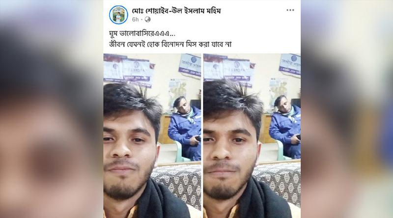 এ ছাড়া ডিউটিরত অবস্থায় ঘুমন্ত এক পুলিশ সদস্যের সঙ্গে সেলফি তুলে তা ফেসবুকে পোস্ট করেন মহিম। ছবিটির ক্যাপশনে তিনি লেখেন, ‘ঘুম ভালোবাসিরেএএএ...। জীবন যেমনই হোক বিনোদন মিস করা যাবে না।’