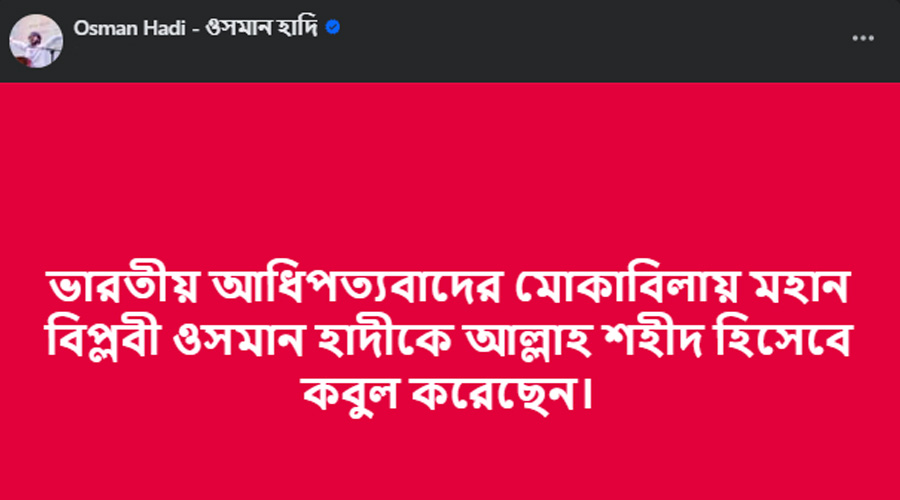 ওই পোস্টে বলা হয়, ‘ভারতীয় আধিপত্যবাদের মোকাবিলায় মহান বিপ্লবী ওসমান হাদিকে আল্লাহ শহীদ হিসেবে কবুল করেছেন।