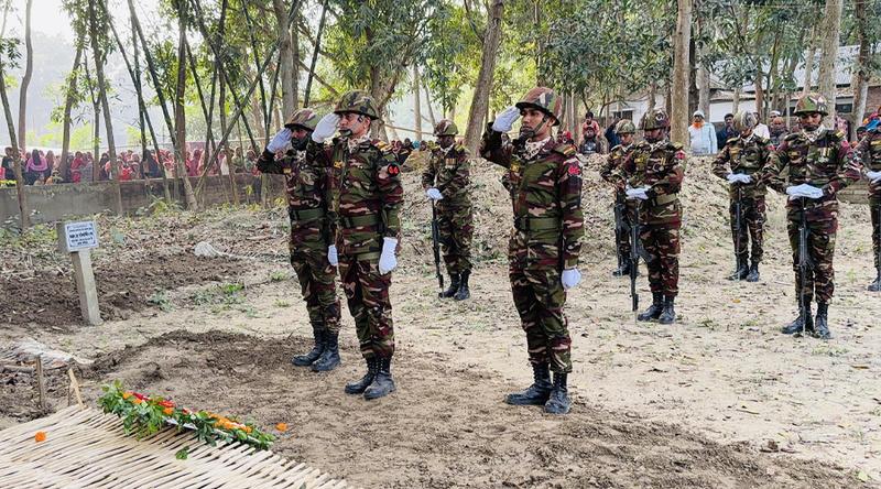 সেখানে স্বজন ও এলাকাবাসীর দেখার জন্য প্রায় আধাঘণ্টা মরদেহটি রাখা হয়। এরপর বাড়ির কাছে পারিবারিক কবরস্থানে নিয়ে জানাজা নামাজ শেষে যথাযথ সামরিক মর্যাদায় তাকে সমাহিত করা হয়।