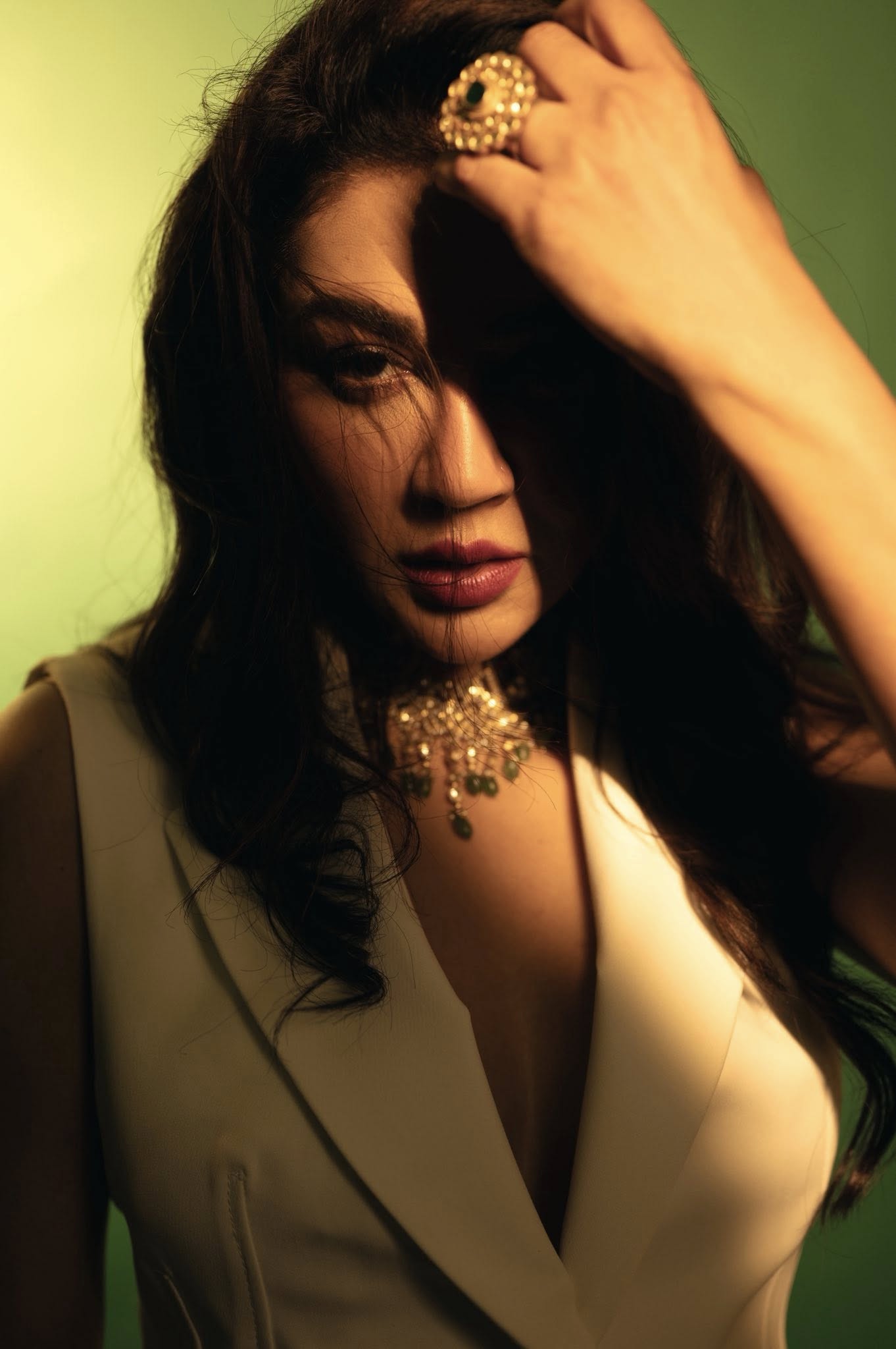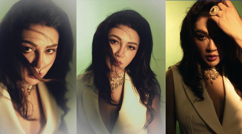 গলায় ছিল সোনালি চোকার, যার ঠিক মাঝখানে সবুজ পাথরের ছোঁয়া ছবির কালার টোনের সঙ্গে একটি সূক্ষ্ম অথচ জোরালো কনট্রাস্ট তৈরি করেছে। গয়নার ক্ষেত্রে তিনি যে মিনিমালিস্ট কিন্তু 'স্টেটমেন্ট' পছন্দ করেন, তার প্রমাণ মেলে হাতের বড় স্টেটমেন্ট রিংটিতে।