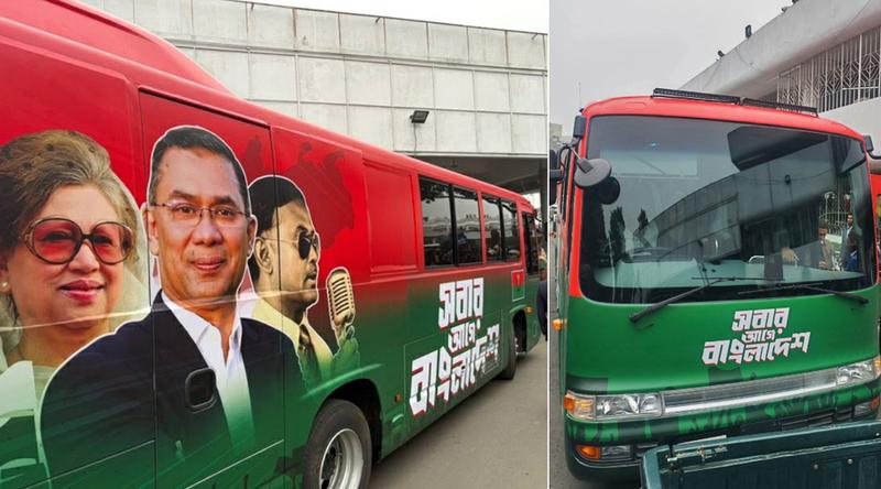 আজ বৃহস্পতিবার (২৫ ডিসেম্বর) সকালে বিমানবন্দরের সিআইপি গেটে দেখা যায়, বিশেষভাবে প্রস্তুত এই বাসটি লাল ও সবুজ রঙে সজ্জিত। বাসটির গায়ে বিএনপি চেয়ারপারসন খালেদা জিয়া, বিএনপির ভারপ্রাপ্ত চেয়ারম্যান তারেক রহমান এবং দলের প্রতিষ্ঠাতা শহীদ রাষ্ট্রপতি জিয়াউর রহমানের বড় আকারের প্রতিকৃতি রয়েছে।