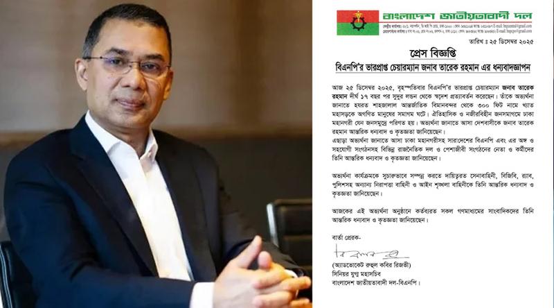 এতে বলা হয়, বিএনপির ভারপ্রাপ্ত চেয়ারম্যান তারেক রহমান দীর্ঘ ১৭ বছর পর সুদূর লন্ডন থেকে স্বদেশ প্রত্যাবর্তন করেছেন। তাকে অভ্যর্থনা জানাতে হযরত শাহজালাল আন্তর্জাতিক বিমানবন্দর থেকে জুলাই ৩৬ একপ্রেসওয়ে সংলগ্ন এলাকায় অগণিত মানুষের সমাগম ঘটে। ঐতিহাসিক ও নজিরবিহীন জনসমাগমে ঢাকা মহানগরী যেন জনসমুদ্রে পরিণত হয়। অভ্যর্থনা জানাতে আসা দেশবাসীকে তারেক রহমান আন্তরিক ধন্যবাদ ও কৃতজ্ঞতা জানিয়েছেন।
